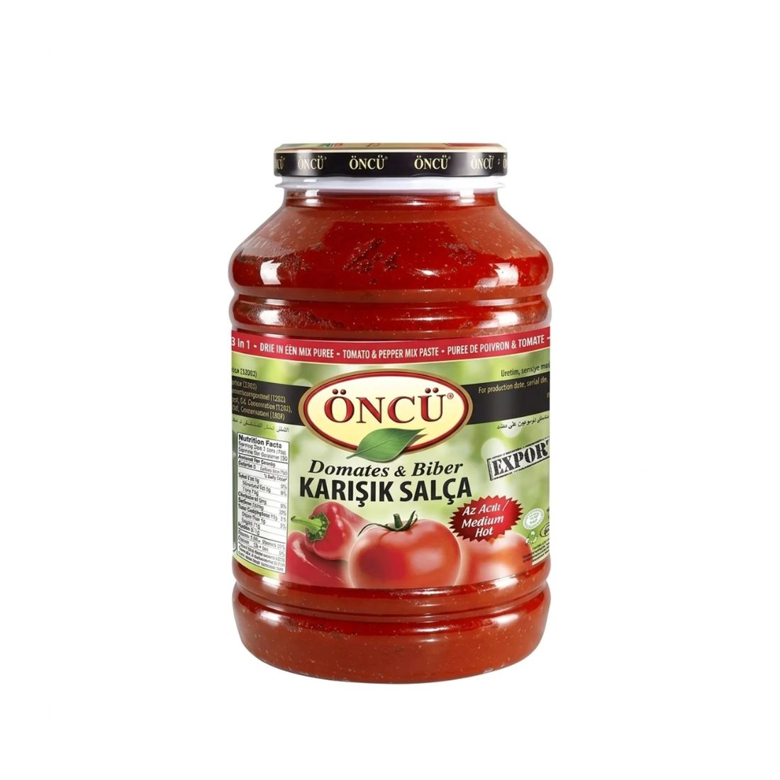 Die beste beider Welten: OENCU Karisik Salca - Tomaten und Paprika gemischt, Az Acili, 3,2 kg fuer 13,99 Euro.